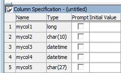 5. In the column specification view, notice that mycol2 is mapped to char(10) and mycol5 is mapped to char(27).