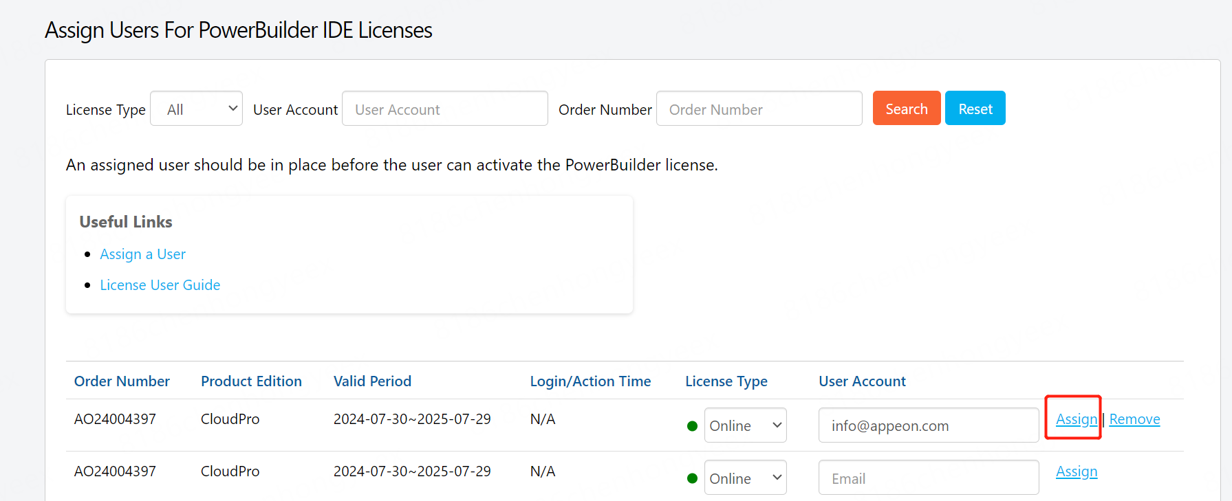- Online License: the assigned user account will be validated, and the binding license will be activated by the Appeon license server immediately during the login process. Step-by-step directions.